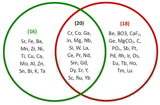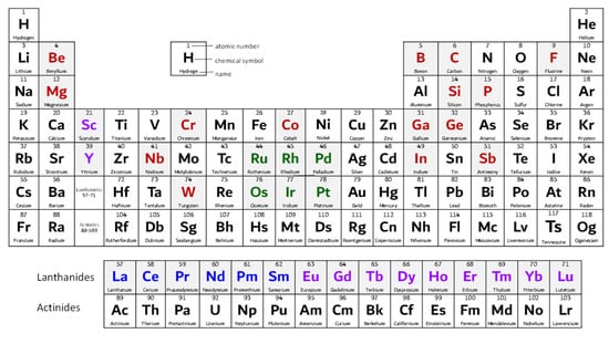 Materials considered as critical raw materials are grouped, Figure 2, and marked in four colors as follows: (i) in red, (ii) in blue, (iii) in magenta and (iv) in green. The term ‘rare earth elements’ (acronym REEs) is a collective name for the 15 elements in the lanthanide group and they are categorized into rare earth elements-light (acronym LREE)—marked in blue; and rare earth elements-heavy (acronym HREE)—marked in magenta. Marked in green are the six precious metals, platinum group metals (acronym PGMs), which include ruthenium, rhodium, palladium, osmium, iridium and platinum [17]. Due to some of their similar properties, scandium and yttrium are also often considered as rare earth elements [18,19,20]. The rest of the critical raw materials, not classified as rare earth elements or precious metals, are marked in red.