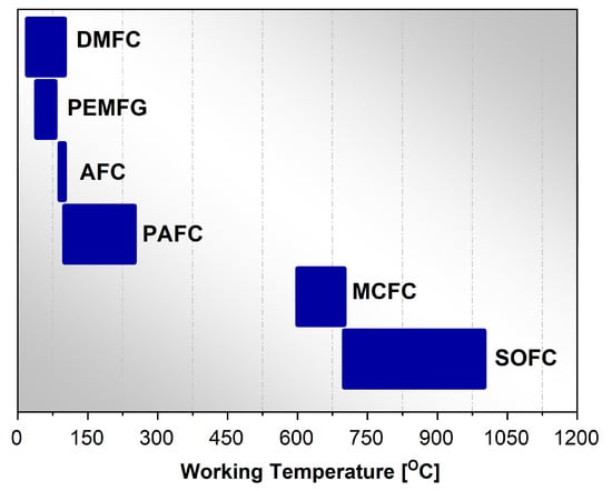 Figure 3, a horizontal bar chart, illustrates the operating temperature ranges for different types of fuel cells. The x-axis displays the operating temperature in degrees Celsius (C), which ranges from 0 to 1200 °C. The y-axis has no specific units, but for clarity in visualization, they were used separately between the types of cells. The y-axis lists the different categories of fuel cells: DMFC, PEMFG, AFC, PAFC, MCFC, and SOFC. Each type of fuel cell is represented by a horizontal bar, indicating its operating temperature range.