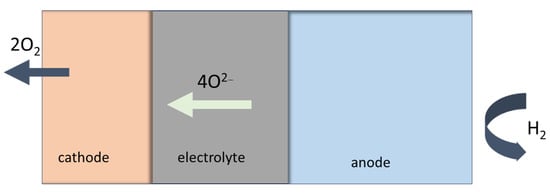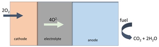 Fuel like hydrogen, natural gas or biogas, is supplied to the anode side. Once the anode is reached, the fuel reacts with the oxygen ions from the electrolyte generating water vapor (H2O), carbon dioxide (CO2) and releasing electrons see Figure 4. The anode itself is catalytically active, and it is promoting the electrochemical reactions. At the cathode, the oxygen from the air or from an oxygen-containing gas is reacting with the electrons and oxygen ions. The oxygen ions are conducted through an electrolyte to form oxygen gas (O2−). The cathode material acts as a catalyst enhancing the oxygen reduction reaction. The solid electrolyte allows the migration of oxygen ions from the cathode to the anode.