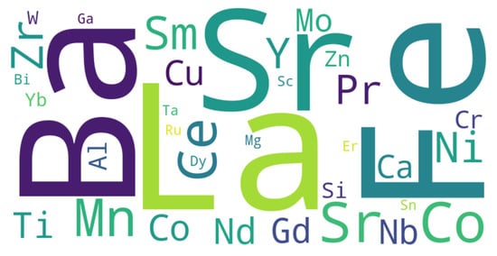 The word cloud features the chemical elements, collected from the literature, commonly associated with materials used in SOFCs and SOECs [30,31,32,33,34,35]. Elements that are larger and more central, such as La, Sr, Co, Ba, and Ni, indicate their more frequent use in materials from the SOFC and SOEC components, which means that they are also important. Each element contributes distinct physico-chemical properties that are critical to the performance of various components within SOFCs and SOECs, such as the cathode, anode, and electrolyte.
