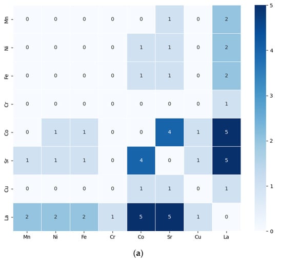 In the heatmap, the value of 5 for the combination of La, Sr, and Co means that these three elements were associated together five times in the dataset being visualized, as they were found together in a set of materials. La, Sr, and Co are elements commonly involved in perovskite oxides for SOFCs/SOECs materials. The value of 4 for the combination of Sr and Co reflects their frequent pairing in oxides for SOFCs/SOECs materials contexts. A moderate frequency of co-occurrence is the combination of La, Fe, Ni, and Mn. The lowest non-zero frequency of co-occurrence, 1, in the heatmap, indicates a rare association between the two elements compared to other combinations with higher values.