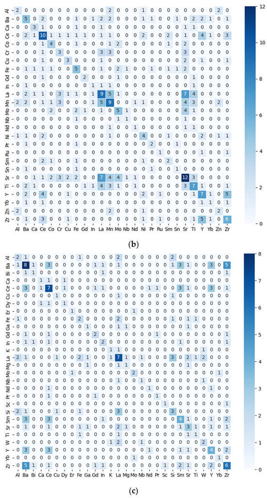 (a) Heatmaps of co-occurrence SOFCs and SOECs cathode materials; (b) heatmaps of co-occurrence SOFCs and SOECs anode materials; and (a,c) heatmaps of co-occurrence SOFCs and SOECs electrolyte materials.