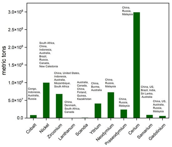 Lanthanum, found abundantly in monazite and bastnäsite, shares similar crustal prevalence with cobalt and is sourced mainly from China, Australia and Russia, reflecting the global distribution of rare earth elements [36,37,38,39,40]. The Democratic Republic of Congo is the primary source of cobalt production, with China and Zambia also contributing significantly [36,37,41,42]. Political instability in the Democratic Republic of Congo places a substantial risk to the global cobalt supply. The international supply of nickel has been significantly impacted by recent export-related policies put in place by the Indonesian government. China and South Africa are the primary suppliers of zirconium. China dominates the production of lanthanum, although the United States and Guinea also contribute a significant portion. China is the sole producer of scandia, highlighting a potential supply bottleneck for this critical material. China, Russia, and Malaysia are the main producers of yttrium. Neodymium, praseodymium, cerium, samarium, and gadolinium are primarily produced in China, with some contributions from the United States, Australia, and Malaysia [36,37,38,39,40].