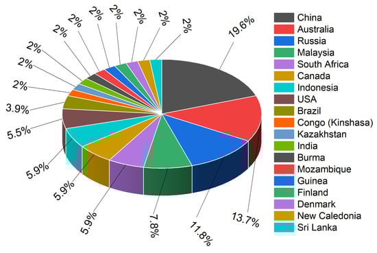 In Figure 9, the analysis is extended based on regional aspect. Each country is linked to specific elements, illustrating the presence of these nations in the extraction/production of particular resources [36,37]. The scale helps to show which countries dominate the production or extraction of these materials, allowing easy comparison between countries and materials. The elements listed are shown on the x-axis, while the y-axis, numerical, indicates the presence of these elements within the countries in metric tons. The chart uses a vertical bars scheme to distinguish between different countries and their associations with particular elements.