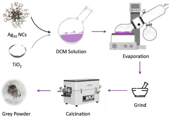 Figure 1 illustrates the schematic representation of the preparation process for TiO2 samples sintered with Ag33 nanoclusters. The Ag33 nanocluster co-protected by triphenylphosphine and 4-chlorobenzylmercaptan was selected as the precursor owing to its relatively good stability. Unlike the Ag33 nanocluster synthesized with 2-phenylethanethiol, which requires additional triphenylphosphine for stabilization, this nanocluster can be stably dissolved in pure dichloromethane (DCM), resulting in a violet solution with two absorption bands centered at 533 nm and 475 nm (Figure S1), which is in agreement with previous reports [25]. After adding a typical amount of commercial TiO2 (P25, Degussa), the obtained solution was then sealed into a rotary evaporator to allow the solvent to evaporate completely. This process resulted in mauve solid products stuck on the flask. The obtained products were then collected and ground to produce Ag33-loaded TiO2 (abbreviated as Ag33/TiO2) samples. In these samples, the Ag33 nanoclusters interacted weakly with the TiO2 surface due to the presence of the ligands. Removing the ligands could be accomplished by calcining the samples in a tube furnace under the flow of nitrogen gas, which eventually generated a grey powder.