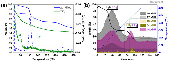 Comparison of the TG analysis of TiO2 and Ag33/TiO2 samples (a) and the TG-MS spectrum of the Ag33/TiO2 samples (b).