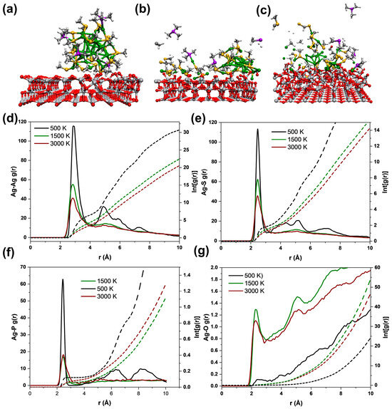 Snapshots from the AIMD of Ag33 on the (001) facet of TiO2 at 500 K (a), 1500 K (b), and 3000 K (c) after the systems reached equilibrium, along with the corresponding pair distribution function (the solid line) and its integral (the dash line) for Ag-Ag (d), Ag-S (e), Ag-P (f), and Ag-O (g) of these systems.