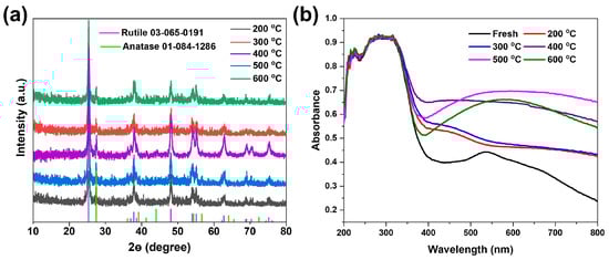 Based on the above results, we then calcined the Ag33-loaded TiO2 samples starting at 200 °C and at intervals of 100 °C under a nitrogen atmosphere to obtain different samples. Powder X-ray diffraction (PXRD) results show that all the obtained samples are composed of anatase and rutile, with no impurity peaks observed, demonstrating that the Ag species were not crystalized as large particles on the TiO2 samples (Figure 4a). As the Ag33 nanoclusters exhibited distinct optical absorption in the visible range, we then collected the UV-visible diffuse reflection spectra of the as-obtained samples. Pure TiO2 is a UV-responsive semiconductor with an absorption edge below 420 nm, meaning it cannot absorb visible light. When loaded with Ag33 nanoclusters, broad absorption in the visible range with a characteristic peak at ~540 nm is clearly observed (Figure 4b, black line). The absorption primarily corresponds to the Ag33 nanoclusters in the solution (Figure S1), suggesting that the structure of the nanoclusters is preserved on the TiO2 surface. However, calcining the samples at 200 °C or 300 °C caused a change in the peak shape, with the characteristic peak degrading and a new weak absorption feature appearing around 430 nm (Figure 4b, red and blue lines). This absorption is similar to the plasmon resonance effect observed in metallic Ag nanoparticles, suggesting that the removal of ligands at low temperatures may cause the nanoclusters to fuse into larger particles. Raising the temperature to 400 °C led to a flattening of the visible absorption, accompanied by an increase in absorption intensity (Figure 4b, violet line). We attribute the changes to the combined effects of Ag clusters sintering on the TiO2 surface and oxygen vacancy formation in its subsurface. Further increasing the temperature of the calcination to 500 °C and 600 °C resulted in an absorption decrease near the band edge of TiO2, while the following visible absorption was enhanced. These results indicate that the removal of ligands from Ag33 nanoclusters on the surface of TiO2 at different temperatures leads to the formation of Ag species-sintered TiO2 samples with different surface characteristics.