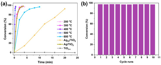 The catalytic activity of Ag33/TiO2 after treatment at different temperatures (a) for 4-NP reduction and the reusability evaluation of the Ag33/TiO2 samples after 400 °C treatment (b).