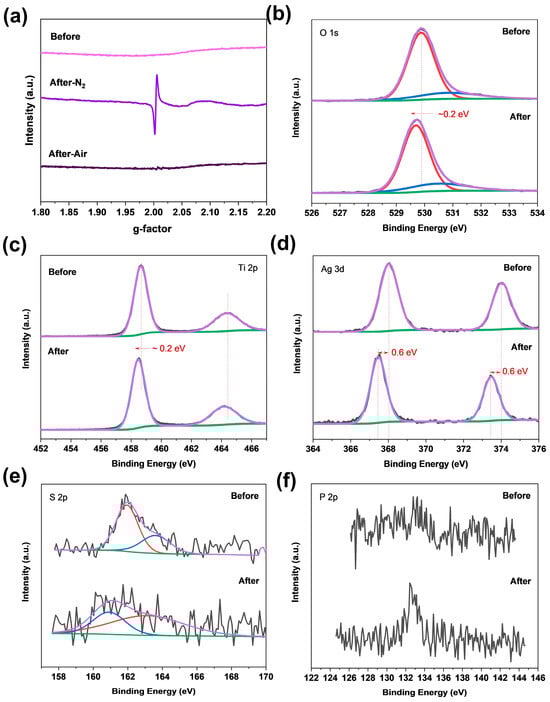 EPR (a) and high-resolution XPS spectra of O 1s (b), Ti 2p (c), Ag 3d (d), S 2p (e), and P 2p (f) of the Ag33-loaded TiO2 before and after calcination.