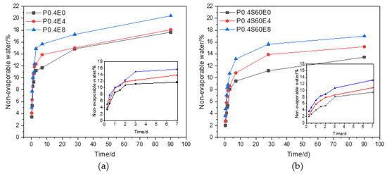 The content of non-evaporable water in cement paste is positively proportional to the degree of hydration to a certain extent [25]. Figure 11 plots the non-evaporable water content with the age of pure cement paste and cement–slag composite paste with different CEA dosages. The non-evaporable water content of cement paste increased rapidly within 3 d and then gradually increased with the increase of age. In addition, the non-evaporable water content of cement paste increased gradually with the increase of CEA dosage. This shows that cement paste rapidly hydrates within 3 d, and the addition of CEA can accelerate the hydration of cement paste and increase the hydration degree of cement paste.