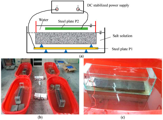 According to ASTM C 1262-05 [41] and reference [42], a salt corrosion test scheme was designed to accelerate the indoor salt corrosion test without causing deterioration different from the natural environment by using a constant current acceleration method. The salt corrosion includes two stages: accelerated migration corrosion (Stage I) and immersion corrosion (Stage II). The schematic diagram of electromigration-accelerated ion corrosion is shown in Figure 3. A glass container with tap water was placed on the top surface of the concrete column and was bonded to the top surface with structural adhesive to ensure sealing. The entire column was immersed in the prepared composite salt corrosion solution, and two stainless steel plates were placed at the bottom of the composite salt solution and the water, respectively, which are marked as P1 and P2. A direct current (DC) stabilized power source of 14 V was applied between P1 and P2. P1 was connected to the negative electrode, and P2 was connected to the positive electrode. The electromigration acceleration lasted 7 days, and the change in mass and dynamic modulus was recorded every day. The change in mass and UPV were recorded every 5 days during the 30 days of immersion corrosion. To avoid water evaporation and electromigration consumption, each column was reconfigured with new composite salt solutions before immersion corrosion to ensure the salt solution concentration was consistent with the designed concentration.