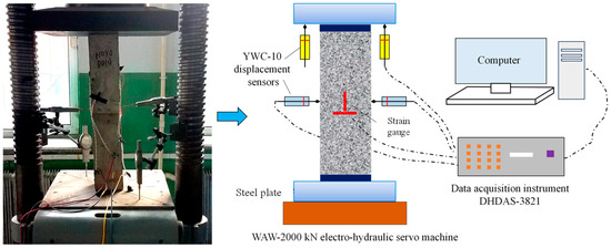 Following exposure to varying numbers of F-T cycles, axial compression bearing capacity tests were performed on the reinforced concrete columns. Figure 4 shows the schematic diagram of the axial compression strength test device. Considering that the surface of the column becomes rough after experiencing F-T cycles and salt corrosion, the end of the column was first polished. Subsequently, displacement sensors were installed to measure the deflection, and the dynamic signal acquisition instrument was connected to collect the measured data. Then, the specimens were placed at the geometric center of the upper and lower loading plates and preloaded three times to mitigate the effects of uneven ends and gaps between these plates. The preloading was 5% of the estimated ultimate bearing capacity. After that, the column was stage loaded. For the first stage, the load increment was 30 kN with a loading rate of 2 kN/s until reaching 80% of the estimated capacity. For the second stage, the load increment was 20 kN with a loading rate of 1 kN/s until column failure. At the end of each load increment, the load was held for 15 min.