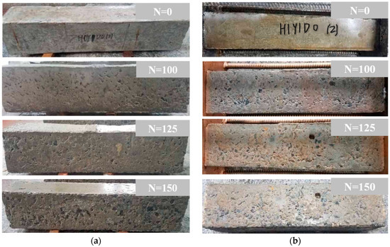 Figure 6 demonstrates the damage of the reinforced concrete column after different F-T cycles under a composite salt solution. Figure 6a represents the deterioration of the unloaded specimens. Due to electrochemical ion corrosion, the surface of the reinforced concrete column connected to the positive electrode shows obvious rusting. After 75 F-T cycles, the surface mortar starts to spall, and the surfaces of the column become loose after 100 F-T cycles. After 125 F-T cycles, the coarse aggregate is exposed and even falls at the corner of the column. After 150 F-T cycles, the deterioration of the reinforced concrete columns is aggravated. Compared with Figure 5a, it can be seen that the surface deterioration of the reinforced concrete column is more serious under the combined action of salt solution erosion and F-T cycles.