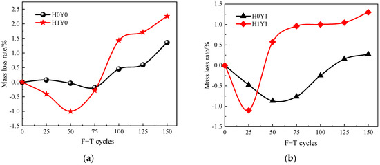 Mass loss rate after frost damage. (a) H0Y0 and H1Y0, (b) H0Y1 and H1Y1.