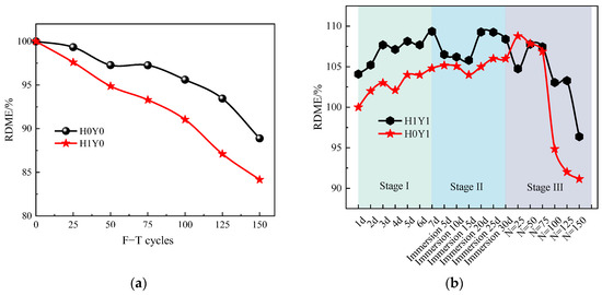 The RDME variation of the reinforced concrete specimens under a composite salt solution is shown in Figure 8b. Stage I represents the process of electrochemical-accelerated ion migration, stage II is the change in the RDME after the full immersion in the composite salt solution, and stage III represents the change in the RDME after F-T cycles under a composite salt solution. From Figure 8b, it can be seen that before the F-T cycles, the RDME of both H1Y1 and H0Y1 shows a fluctuation-increasing trend. This is because during the process of salt solution erosion, physical and chemical reactions occur between the hydration products inside the concrete and salt solution, producing ettringite, gypsum, calcite, and other products [37]. This improves the compactness of the concrete and is beneficial to the anti-frost performance. After 100 F-T cycles, the RDME of H0Y1 decreases rapidly and then slows down. After 150 F-T cycles, the RDME of H0Y1 decreases to 91.14%.