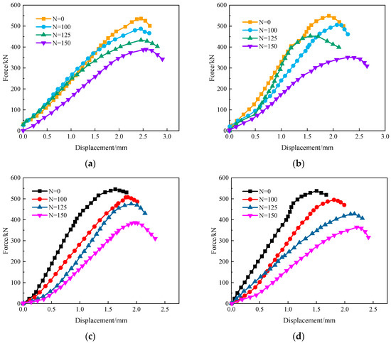Force–displacement curves of reinforced concrete columns under different conditions with the same F-T cycles. (a) N = 0 cycles, (b) N = 100 cycles, (c) N = 125 cycles, (d) N = 150 cycles.