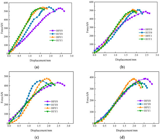 Force–displacement curves of reinforced concrete columns under axial compression with different F-T cycles. (a) H0Y0, (b) H1Y0, (c) H0Y1, (d) H1Y1.