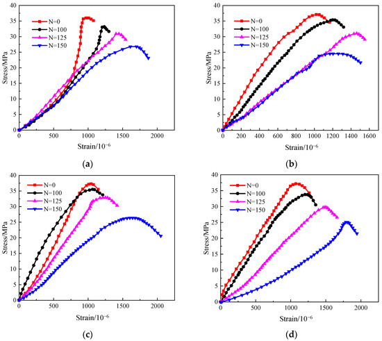 Figure 13 presents the stress–strain curves after various numbers of freeze–thaw cycles (N = 0, 100, 125, and 150 cycles). As observed from the figure, the stress–strain curves of the reinforced concrete columns exhibit similar trends under all tested conditions. With an increasing number of freeze–thaw cycles, the slope of the ascending segment of the curves decreases, indicating a reduction in the stiffness of the reinforced concrete columns. The peak stress gradually diminishes as the number of freeze–thaw cycles increases, while the peak strain consistently increases. This phenomenon is attributed to alterations in the micro-pore structure within the reinforced concrete columns resulting from the combined effects of freeze–thaw cycling, salt corrosion, and sustained loading. These alterations cause gradual interconnection among some pores, leading to a redistribution of internal forces and the generation of damage from surface to interior. On one hand, this results in a decline in mechanical properties; on the other hand, it leads to a compaction effect within the reinforced concrete, manifesting as decreased stiffness, increased strain, and an enhanced plastic deformation capacity. These findings are consistent with conclusions drawn in previous studies [12,30,47].