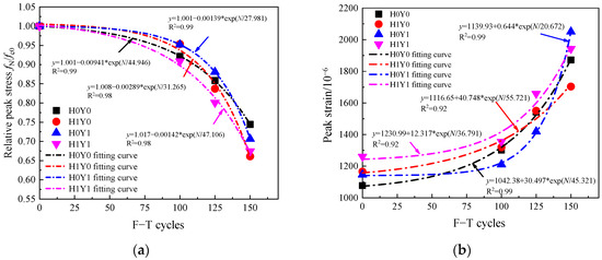 According to the experimental results, Figure 14a,b illustrates the variations of relative peak stress and peak strain, respectively, with the number of F-T cycles under different load cases. The figure demonstrates a consistent decrease in relative peak stress as the number of freeze–thaw cycles increases, while peak strain exhibits an opposite trend of continuous augmentation. It is worth noting that minimal changes are observed in peak strain before 100 F-T cycles. However, a significant acceleration in the rate of peak strain growth becomes evident after 125 cycles. An exponential function decay model can effectively depict the relationship between both relative peak stress and peak strain with respect to the number of F-T cycles; this is consistent with the phenomenon observed by Bao et al. [22].