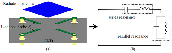 The basic structure of the filter antenna was chosen to be a patch antenna fed by an L-shaped probe, and the schematic structure is shown in Figure 2a. Its equivalent circuit diagram is shown in Figure 2b, and vertical and horizontal components can be equivalent to the integrated circuit of series resonance and parallel resonance. The feeding method is an important aspect that affects the performance of the microstrip antenna, and the common feeding methods mainly include slit-coupled feeding, probe feeding and microstrip line feeding. Among them, the probe feed is one of the more widely used feed methods. However, for the patch antenna with a thick dielectric layer, when the probe is longer, it will lead to the inductive enhancement of the antenna input impedance and affect the bandwidth of the antenna. In this design, the L-shaped probe feed can effectively overcome this effect.