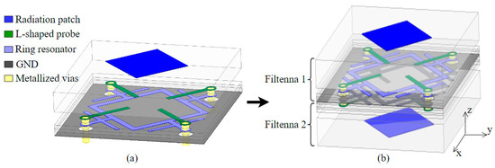 The brief structure of the FA-FA-based FSS element is shown in Figure 3. The filtering antenna is shown in Figure 3a, which is made of a patch antenna (in blue), L-type feeding probe (in green), ring resonator (in purple) and background (in gray), from top to bottom. The feeding was positioned between the patch and ring resonator to receive or transmit the EM waves. Figure 3b shows the FA-FA-based FSS element which was constructed by two filtering antennas. The two antennas were positioned back to back, connected by the vias at the terminals of the feeding of the antennas. The antennas shared the background. When electromagnetic waves were incident to one side of the FSS, the filter antenna array on that side received the energy and transmitted it to the filter antenna array on the other side to complete the outgoing emission.