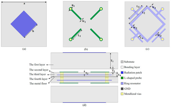 The FSS proposed in this paper employs a multilayer structure, and since the structure is highly symmetric, only the composition of the upper half is presented in detail. As shown in Figure 4d, the first dielectric layer is made of F4B sheet with a dielectric constant εr = 2.65 and thickness of 1.5 mm. The second and fourth layer ere also made of F4B sheet with a dielectric constant εr = 2.65, but with a thickness of 0.17 mm. The third layer was the adhesive layer, and an FR4 sheet with a thickness of 0.1 mm was used. The length and width of all dielectric plates were 4.9 mm. The radiation patch was printed on the upper surface of the first dielectric plate, as shown in Figure 4a. The bent L-shaped metal arm was printed on the upper surface of the second layer of dielectric plate, as shown in Figure 4b, which can couple with the radiation patch and gather energy at resonance. The metal structure printed on the upper surface of the fourth dielectric plate is shown in Figure 4c. The square ring was equivalent to paralleling the parasitic structure underneath the L-shaped metal arm so that it can couple with the metal post to introduce both inductance and capacitance with each metal layer to generate a strong resonance. By controlling the length and width of the metal square ring, the FSS down-roll bandwidth can be controlled. Furthermore, the metal strips connected in parallel at the connection between the square ring and the metal post can optimize the high-frequency out-of-band rejection of the FSS.