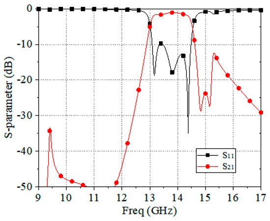 Due to the high symmetry of the proposed FSS, the designed FSS had good polarization stability at the incidence of electromagnetic waves with different polarizations, and there existed a good consistency in the S-parameter frequency response. The transmission and reflection coefficients at the vertical incidence of TE waves are shown in Figure 5. The proposed FSS had a good polarization stability at the incidence of electromagnetic waves with different polarizations, and there existed a good consistency in the S-parameter frequency response. The simulation results show that the proposed FSS had a passband from 13.06 GHz to 14.46 GHz and a flat in-band frequency response. The lower roll-off bandwidth and upper roll-off bandwidth reached 1% and 1.2% of the center frequency, respectively, to achieve a sharp roll-off skirt. The out-of-band rejection was also good.