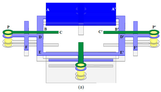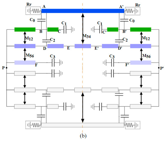 The filtering characteristics of the FSS were further investigated, and a simplified equivalent transmission line model was constructed to analyze the structure of each layer of the designed FSS unit, as shown in Figure 6. The FSS unit was designed to be a microstrip line structure, and the coupling effect can be equivalent to the capacitive effect. And according to the microstrip line theory, the coupling effect in the microstrip line structure can be equated to the capacitance effect. When an electromagnetic wave is incident on the FSS cell, the energy radiated into free space is equivalently represented by two radiation resistances Rr. The second layer of the curved L-shaped metal arm is represented by capacitance C0 between it and the top layer of patch A. The fourth layer between the metal structure and the top layer patch A is represented by the capacitance C2. The coupling effect between the bent L-shaped metal arm (P-B) and the square ring (P-D) is represented by the mutual coupling coefficient M12. The coupling effect between the square ring (E-E’) and the edge of the patch (A-A’) is represented by the mutual coupling coefficient M34. The coupling effect between the metal strip (F) and the square ring (P-D) is represented by the mutual coupling coefficient M56. The validation results show that good out-of-band rejection capability of the designed FSS can be realized by adjusting these parameters.