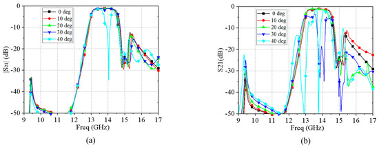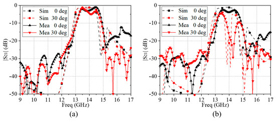 Based on the analysis of angular stability, the simulated S-parameters for two different polarizations of electromagnetic waves obliquely incident to the FSS are given in Figure 7a,b, respectively. Overall, the stability under TE polarization is good and can maintain good angular stability over the 0°–30° incidence angle range.