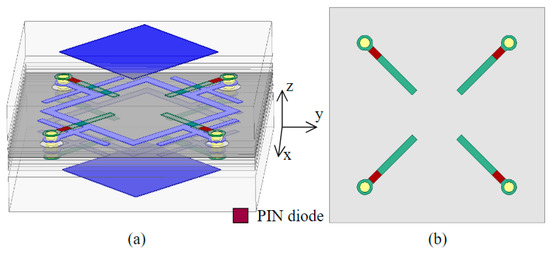 As discussed above, one of the advantages of our proposed FA-FA-based FSS is the convenience for the realization of reconfigurable manipulation functions by adding active components in the circuit lines. To give a preliminary verification, a reconfigurable design based on the proposed ACA FSS was also implemented. The schematic of the proposed reconfigurable unit cell is shown in Figure 8.