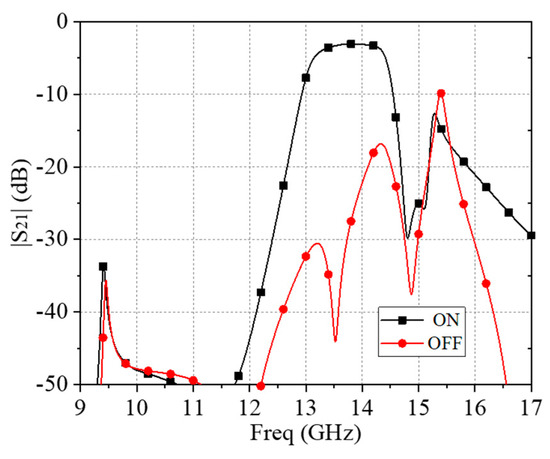 Four PIN diodes were inserted in the terminal of each branch of the feeding lines on the second dielectric layer of the original structure. The air between the first and second layer provided the necessary space for loading PIN diodes. The diode was approximately modeled as a 2.1 Ω resistor for the ON-state and a parallel circuit of a 0.17 pF capacitor and a 3 kΩ resistor for OFF-state according to Ref. [21]. To verify the performances of the proposed reconfigurable ACA FSS unit cell, the full-wave simulation was implemented by the HFSS 2023R1 software. The comparison of the simulated transmission magnitude of designed unit cell with PIN diodes in ON state and OFF state is given in Figure 9. As seen, the reconfigurable ACA FSS kept bandpass characteristics when the diodes were in the ON state. The −3 dB bandwidth of the passband was from 13.07 GHz to 14.46 GHz with an insertion loss of 3.1 dB, while it performed total reflection when the diodes were in the OFF state. Notably, this was only a preliminary verification, so bias lines were not added in the simulation at present. For a more realistic situation, bias lines should be considered and suitably designed to minimize the impact on the EM waves as much as possible. As shown in Figure 9, the transmission decreased to around −3 dB in the ON case, which was caused by the loss of employed PIN diodes. The diodes used here were BAR64, which have a 2.1 Ω resistance at this working band. This deterioration can be solved by replacing the type of diode or optimizing the introduced position.