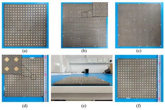 We designed and fabricated the prototype of the proposed frequency-selective surface (FSS). As shown in Figure 10, the FSS consisted of three layers: upper, middle and lower, which were constructed from three individual dielectric plates. To accommodate the metallized vias required in the middle layer, we utilized multiple nylon post screws combined with gaskets for compression. The dielectric plates were made of F4B, with a dielectric constant of 2.65. The single-layer dielectric plate was formed by bonding and stacking multiple layers of F4B, with a thickness of 0.17 mm. The adhesive layer between the F4B layers was made of FR4 with a thickness of 0.1 mm. A metal pattern was fabricated on the F4B plate with a metal layer thickness of 0.035 mm. The overall dimensions of the FSS prototype were 227.6 mm × 227.6 mm × 4.62 mm and consisted of 16 × 16 units.