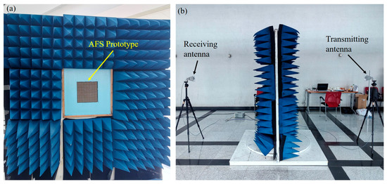 The far-field transmission of the FSS was measured in an open space. In the experiment, two standard horn antennas were placed on either side of the FSS, serving as transmitting and receiving antennas, as shown in Figure 11. The test FSS prototype was positioned at the center of the measurement window, perpendicular to the ground, surrounded by absorbing materials to minimize scattering interference and surface reflections. Two standard horn antennas, operating in the frequency range of 2–18 GHz were mounted on tripods horizontally opposite to each other and perpendicular to the FSS prototype. The horn antennas were connected to two ports of a vector network analyzer (Agilent N9918A, which is manufactured by Keysight Technologies (formerly Agilent) in Santa Rosa, CA, USA), ensuring that the distance between the horn antennas and the sample satisfied the far-field conditions of the NRL standard. By rotating the platform equipped with the FSS prototype and changing the polarization of the horn antennas, the FSS transmission responses for TE and TM waves were measured, respectively, at incident angles of 0° and 30°.