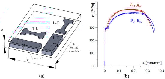 Specimens for uniaxial tensile and fracture toughness tests were made from cuts taken of the crane components marked as A and B (Figure 1b). All test specimens were cut from elements A and B in longitudinal (specimen codes—ALT and BLT) and transverse (specimen codes—ATL and BTL) orientations according to rolling direction (Figure 3a). For specimens of longitudinal orientation, the plane of fracture propagation was perpendicular, and for specimens of transverse orientation, the plane of fracture was parallel to the rolling direction when they were tested.