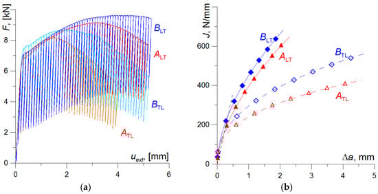 The load—displacement, F—uext, diagrams (a), and JR resistance curves (b) for the tested specimens.