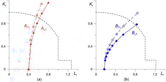 The material condition was assessed according to the Failure Assessment Diagram (FAD) approach, which compares the state of stresses and strains in the material of the element under analysis with a critical state defined by a failure line, FAD. The FAD line diagrams depend on the strength and plasticity characteristics of the material. The state of the material is expressed by the normalised load Lr = σref/σYS (or P/P0, where P0 is the load causing a plastic collapse of the element) and the normalised fracture toughness Kr = KI/Kmat. Figure 7 shows the material condition analysis diagrams for elements A and B. The FAD line is drawn according to Formulas (3)–(9), which are recommended for the first level of analysis: