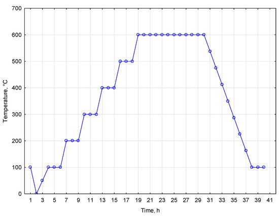 The ash content of native miscanthus was determined using a laboratory muffle furnace to evaluate the biomass suitability for various applications. Initially, approximately 1 g of dried miscanthus samples was weighed accurately. The samples were subjected to an initial thermal treatment, heated to 100 °C, and held at that temperature for 1 h. This preliminary step was critical for evaporating moisture from the samples, ensuring that subsequent measurements reflected the accurate ash content. The samples underwent a series of incremental temperature increases following the initial heating. The first cycle involved heating the samples to 200 °C for 1 h, facilitating the decomposition of organic materials. This procedure was repeated at 300 °C, 400 °C, and 500 °C, with each heating step lasting 1 h. Each temperature increment allowed for the progressive combustion of residual organic matter. After reaching 500 °C, the temperature was further increased to 600 °C, where the samples were maintained for 6 h. This extended exposure to high temperatures was essential for the complete combustion of remaining materials, thereby providing a precise measurement of ash content. Upon completion of the 6 h duration at 600 °C, the temperature was gradually reduced to 100 °C over a programmed period of 4 h. The whole temperature program is presented in Figure 1.