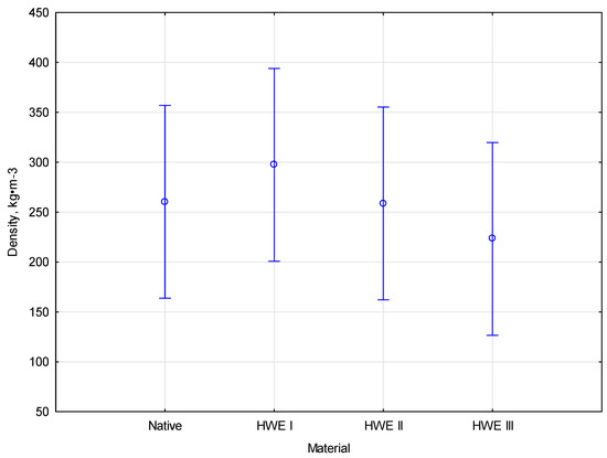 Compaction is more efficient when particles are packed better using the HWE process, possibly due to modifications in the material’s composition or structure. In contrast, raw materials without pre-treatment exhibited the lowest densities, falling below 278.5 kg∙m−3. The importance of pre-treatment or modification steps in optimizing the compaction process and achieving desired material properties can be seen in this observation. In order to maximize the final product’s density and associated characteristics for specific applications, compaction process parameters must be controlled with care and understood. The study data were statistically analyzed in order to identify the types of modifications of HWE in camper to deniability. The statistical analysis showed no significant differences between the measured parameters. The empirical statistic F(3, 8) = 0.523 determined that the p-value equals 0.679. The coloration between density and modification type of material is presented in Figure 4.