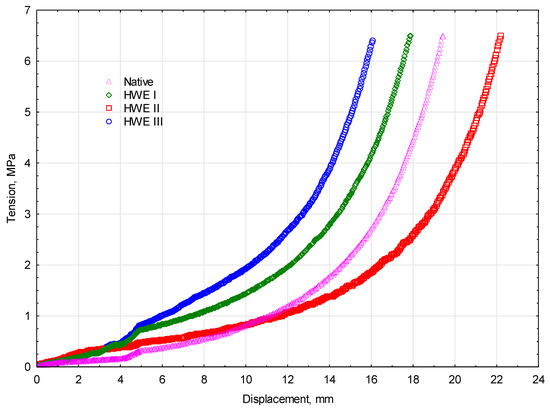 The prepared sample was divided based on the number of native and HWE cycles. Based on how many HWE cycles are performed, Miskantus material compaction partially affects energy expenditure. The total compaction work for a mixture of native material that was not modified was 2.800 × 10−5 J. Native material and material modified by cycles one and two of HWE were in the same group. The final material sample was subjected to three HWE cycles and produced a total work value of 3.470 × 10−5 J. Duncan’s test detailed the differences between groups to optimize the manufacturing process of compacting the subjected material. The effect of miscanthus modification state on energy expenditure enables adjustment of these parameters. Duncan’s test can be beneficial for identifying practical differences between groups. The results are helpful in refining process parameters and modifying miscanthus for specific applications.