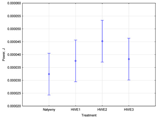 The analytical study examined the effect of HWE modification on the compaction process and energy intensity of the prepared material. Based on the study’s results, it was possible to identify which HWE modification cycle affects the product manufacturing process and the energy spent during raw material compaction. To assess differences between factors and their strength of influence, a one-way analysis of variance (ANOVA) was used. Based on ANOVA and Duncan’s test statistics, it was found that the two groups spent different amounts of energy during compaction. The results determine a degree of significance on the level p = 0.16139, which is higher than the value of 0.05. Duncan’s test allowed the identification of homogeneous groups and detailed comparisons of average energy expenditure values. According to the empirical statistic, the current effect equals F(3, 8) = 2.2362. Optimizing mixture compositions can reduce energy consumption when compacting. Identifying specific parameters that affect the energy efficiency of the process can be the focus of further research. The total compaction work compared to the number of HWE cycles is presented in Figure 6.