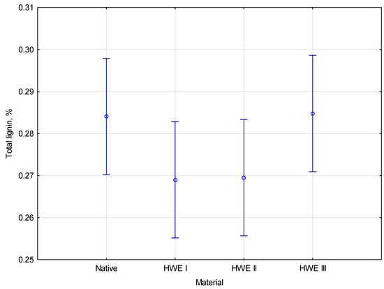 In native material, the total lignin content is 28.4%, with 3.2% coming from ASL and 25.2% from AIL. The total lignin content decreases slightly after the first two cycles (about 5%) compared to the native material. After the first HWE cycle, the total lignin content slightly decreases to 26.9%, with a reduction in both ASL and AIL. After the second HWE cycle, the total lignin content remains relatively stable at 27.0%, with ASL at 3.0% and AIL at 23.9% compared to the miscanthus after the first HWE cycle. The total lignin content returns to its original value (28.5) after the third HWE cycle. The data suggests that the ASL to AIL ratio remains constant across all HWE cycles, indicating that the relative distribution of soluble and insoluble lignin fractions does not change significantly. Most of the reductions in lignin content occur during the first HWE cycle, with limited changes in subsequent cycles. The HWE process appears effective at removing ash from the material while having a minimal impact on the lignin content. Statistical analysis of the lignin content allowed the identification of the types of modifications to HWE. Statistical analysis revealed no significant differences between the measured parameters. Using the empirical statistic F(3, 8), p = 0.17457, we determine that the degree of significance is below 0.05. The coloration between lignin content and the modification type of material is presented in Figure 8.