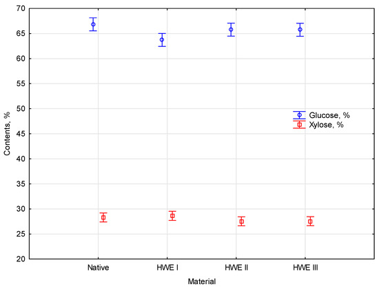 Variations in glucose and xylose after successive cycles of HWE are relatively small, suggesting that HWE has a limited effect on extracting these sugars from the material. The HWE process was carried out at 100 °C. The structural components of the wood are resistant to such temperatures. The least thermally resistant are hemicelluloses, which, among other things, have a lower average degree of polymerization than cellulose. Their thermal degradation begins at temperatures higher than 100 °C. Hot water can cause the leaching of only monosaccharides and selected oligomers from biomass.