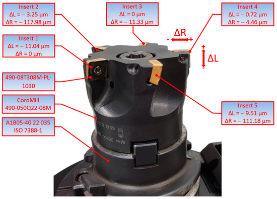Though constant demand for high-quality machine parts has brought about significant advancements in various manufacturing processes, machining is still the best approach. Depending on the type of operation required, single- or multi-point tools are selected. Single-point tools are generally easier to use because of their simple design, but the range of operations they are suitable for is rather limited. Multi-point tools, on the other hand, are more efficient and better suited for machining elements with complex geometries. Multi-point tools can be monolithic or modular with replaceable inserts. The decision of which type to choose will depend on the machining operation, the workpiece material, the dimensional and geometrical requirements, and the production costs. Multi-point monolithic tools are mainly used for finishing tasks, while the modular ones with replaceable inserts are appropriate for rough and semi-rough cuts due to being more universal. Innovations in cutting tool materials, coatings, and insert geometry have made some modular tools suitable also for finishing tasks. Numerous studies analyzed various factors that influence the process of shaping the geometric structure of a surface, as discussed in [1,2]. These factors can have significant effects on surface roughness during machining. According to Abellán-Nebot et al. [1], there are 25 factors responsible for the material removal process, and one of the most important is the axial and radial runout of the cutting tool resulting from the cutter making inaccuracy as well as insert mounting errors. All these factors are classified as process factors related to the resulting cutting processes, such as built-up edge, vibration, or tool wear; operational factors, such as cutting and process parameters; and configuration factors, such as cutting tool, machine tool/fixture, and workpiece factors. Milling cutters are generally produced as modular tools with replaceable inserts. Inserts are made of and coated with expensive advanced materials. Cheaper materials, however, are used for the cutter body. This is extremely practical since worn inserts are simply replaced with new ones and there is no need to sharpen the cutting edges. The major drawback of this approach, however, is the occurrence of axial and radial runout stemming from the dimensional and geometrical errors of the inserts and/or the cutter body as well as errors in the insert mounting when these are mounted or replaced [3]. Axial runout caused by insert mounting errors affects the depth of cut and surface roughness, while radial runout has influence on the feed per tooth and surface roughness, with the latter being dependent on the feed per tooth [4,5,6]. As indicated in previous studies [3,4,7,8], one of the main factors responsible for surface roughness in face milling, associated with variable cutting forces, is the error in the mounting of inserts in the cutter body. In multi-point tools, the runout may arise from edge sharpening errors, insufficient making accuracy with regard to the tool body, the insert, or the pocket the insert goes into, insert mounting errors, and periodic changes in the rigidity of the tool–workpiece system during milling, especially the rigidity of the face mill arbor. It is assumed [4,5] that since the accurate mounting of inserts in the milling cutter is not possible, insert mounting errors will contribute to the variability of the cutting forces in face milling and, as a result, to the surface roughness.