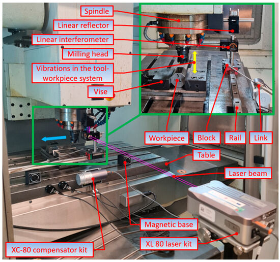 The cutting tests were conducted under dry conditions on a VMC 800 vertical milling center (FOP AVIA, Warsaw, Poland). No cutting fluid was used as the test rig was attached to the milling center. The rig, consisting of a Renishaw XL-80 laser interferometer (Renishaw plc, New Mills Wotton-under-Edge Gloucestershire, Kingswood, UK) and special mirrors, was designed to measure the relative displacements between the workpiece and the tool. The measurements were carried out at a frequency of 500 Hz. The number of measuring points per test varied because of the different values of the feed, changed every 0.02 mm/tooth in the range 0.02–0.22 mm/tooth. Before each milling experiment, the test rig was checked for errors; these could have had some effect on the final measurement results. The measuring data were analyzed using MATLAB R2023a. Figure 2 shows the test rig used in the experiments.