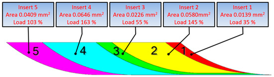 Errors related to the mounting of inserts in the milling cutter are one of the key factors affecting surface roughness. Figure 3 illustrates how each insert is engaged in the material removal process at a feed of 0.2 mm/tooth. Fifty measurements of the setting of each insert placed in the tool body were taken to determine the average axial and radial setting errors. These errors were used to construct the geometric model of the tool using CAD software (Siemens NX 2312). The 3D model of the cutting tool allowed simulation studies and an assessment of how many cutting edges of the milling head are involved in the process of generating the geometric structure of the surface for a given feed per tooth value. Using the model created, it is possible to estimate the load on each insert, the actual feeds per tooth, the instantaneous depths of cut and the cross-sectional area of material removed by each insert. As can be seen, the least loaded inserts are insert No 1 (marked in red) and insert No 3 (in green), while those withstanding the highest loads are insert No 2 (in yellow) and insert No 4 (in blue). Under ideal conditions, each insert should remove the same amount of material, while in practice the values are different. Table 1 provides information on the percentage load each insert is subjected to; here, 100% corresponds to the nominal load at a theoretical value of the feed.