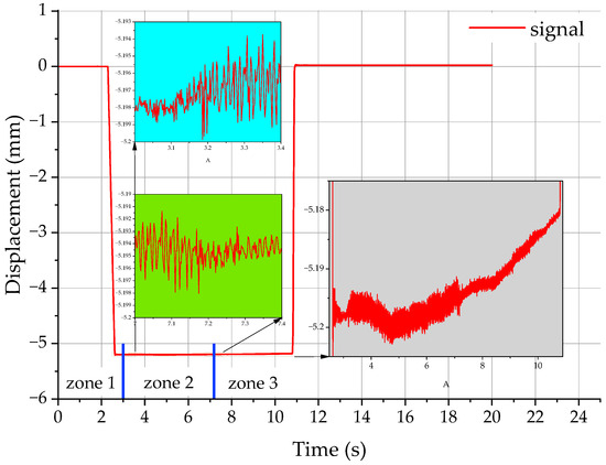 Figure 4 shows a signal registered at a cutting speed of 300 m/min, a feed per tooth of 0.1 mm/tooth and a depth of cut of 0.2 mm. As can be seen from the plot, there was a rapid change in the signal strength from 0 to 5.2 mm in the period between 2.2 s and 11 s. This was not due to a measurement error; it was a purposeful action aimed to introduce the characteristic points (1 and 2) corresponding to the actual tool’s entry points. The shape of the plot of the desired signal in Figure 4 was dependent on the machining program, which assumed that the displacement of the tool along the Z axis was 5 mm and the depth of cut ap was 0.2 mm. Thus, the upper surface of the workpiece was at −5 mm, and the position of the tool was at −5.2 mm after 0.2 mm was removed from the workpiece. The analyzed part of the signal (3.2–7.7 s) corresponds to the proper cutting process. The signal in Figure 4 can be divided into three characteristic zones. Zone 1 represents the phase when the tool approaches the workpiece (0–3.2 s). Zones 2 (3.2–7.2 s) refer to the process of material removal to a required depth (from entry to exit). The last zone 3 represents the no-contact movement of the tool, i.e., retreat to a safety position.