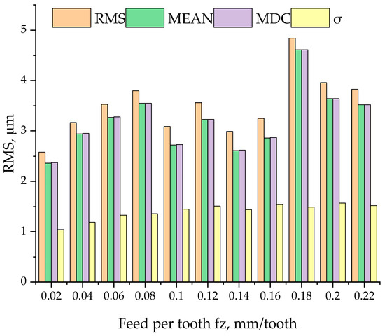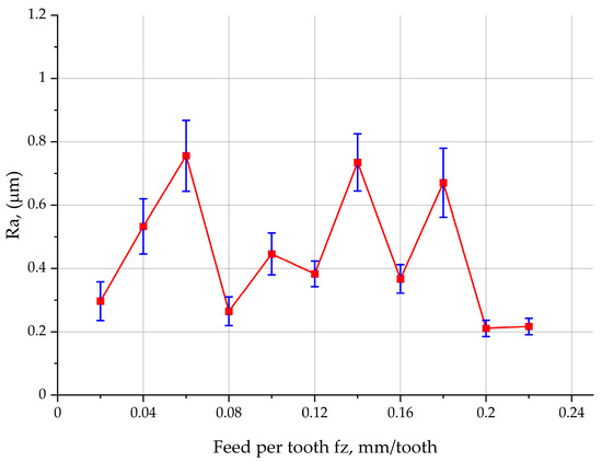 From the diagram in Figure 9, it is clear that the feed negatively affects the parameter Ra. At feeds ranging between 0.02 mm/tooth and 0.06 mm/tooth, an increase in the feed per tooth leads to an increase in Ra. At 0.08 mm/tooth, the value of the surface roughness parameter Ra declines rapidly. A further increase in the feed to 0.12 mm/tooth results in a slight increase in Ra. At 0.14 mm/tooth, the parameter Ra drops significantly, and then, at a feed of 0.16 mm/tooth, it rises substantially again. The lowest values of the parameter Ra can be observed for the range of 0.2–0.22 mm/tooth. The mean width of the profile elements (RSm) increases with increasing feed per tooth to 0.18 mm and then decreases to about 0.5 mm at feeds 0.2–0.22 mm/tooth. At higher feeds (0.02–0.18 mm/tooth), the hybrid roughness parameter Rdq, i.e., the root means square slope, fluctuates around 7°. Like the other parameters, Rdq reaches the lowest value of about 4° at feeds ranging from 0.2 to 0.22 mm/tooth.