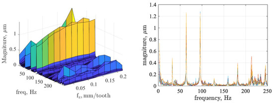 The vibration signals were then analyzed using Fast Fourier Transform (FFT) algorithms. The signal analysis in the amplitude domain shown in Figure 6 revealed some characteristic components related to the tool revolutions during milling: fo—fundamental frequency due to the tool revolutions (31.93 Hz), 2∙fo—first harmonic (63.87 Hz), 3∙fo—second harmonic (95.80 Hz), z·fo—fundamental frequency for a higher number of inserts.