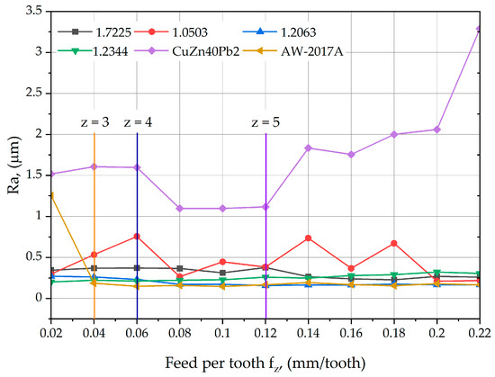 Feed per tooth vs. surface roughness Ra for the face milling for different materials.